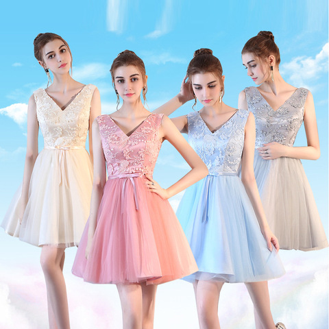 Robe de demoiselle d'honneur, col en V, sans manches, pour soirée de mariage, courte en dentelle, 2017