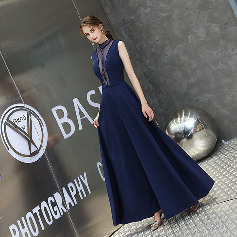 2019 nouveau Design Noble bleu marine une ligne formelle fête robes de bal sans manches longue robe de soirée