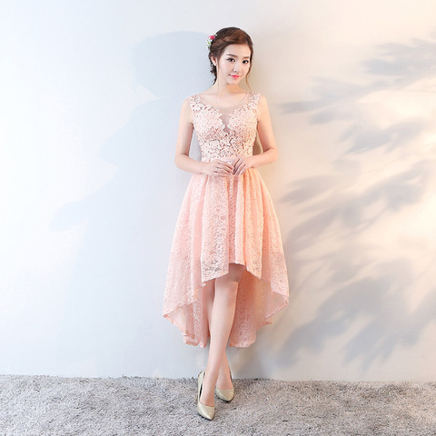 Vestido curto elegante rosa de renda para baile, vestido com frente longa e traseira noturna para baile, primavera 2018
