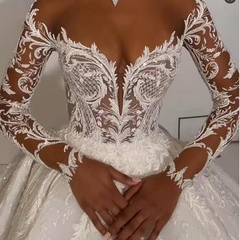 Châu Phi Hot Bán 2026 Sang Trọng Tắt Vai Dài Tay Áo Satin Wedding Dress Bóng Gown Với Đính Cườm Ren Đính Bridal Gown